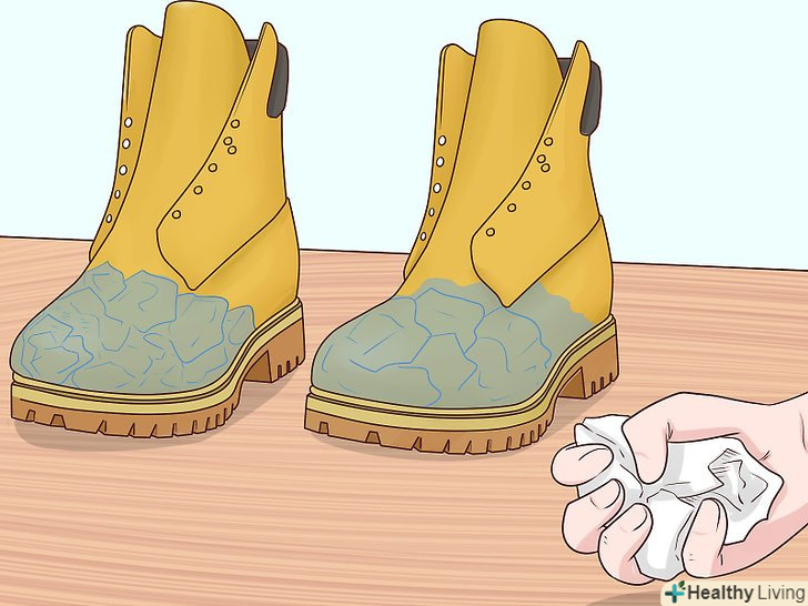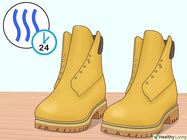 Залиште черевики сохнути на 24 години. після того як почистіть взуття миючим засобом і видаліть з неї всі плями, залиште черевики сохнути в теплому місці. Сушка займе близько 24 годин, але все залежить від того, наскільки сильно встигли промокнути черевики, коли ви їх чистили. [9]- Не ставте черевики поруч з опалювальними приладами, в тому числі біля джерел вогню. Висока температура може розтопити клей, на якому тримається підошва, або пошкодити натуральну шкіру, з якої виготовлені черевики.