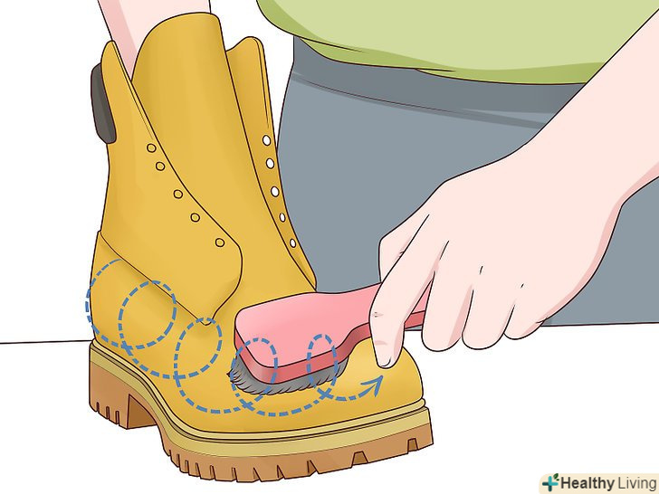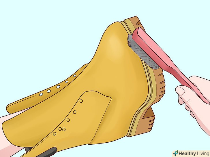 Видаліть легкі забруднення м'якою щіткою. щоб почистити черевики, візьміть м'яку щітку. Почніть з верхньої частини халяви і поступово спускайтеся вниз, працюйте щіткою в напрямку туди-назад, поки не обметете всю поверхню черевик. [2]- Якщо черевики забруднилися зовсім трохи, то м'яка щітка повинна впоратися з такими забрудненнями. Якщо ж на черевиках присутні більш глибокі плями і сильні забруднення, постарайтеся видалити щіткою якомога більше бруду, перш ніж переходити до інших методів очищення взуття.