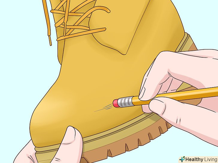 Видаліть брудні відмітини гумкою. візьміть звичайний ластик для простих олівців, спеціальний ластик для замші або ластик з чистячого набору Timberland, щоб видалити брудні відмітини на поверхні черевиків. Злегка потріть гумкою відмітини до тих пір, поки вони не зникнуть. [4]- Ластик здатний впоратися з більшістю легких відмітин від повсякденного носіння взуття. Але він не в змозі якісно видалити в'ївся бруд, якщо вона встигла покрити черевики цілком.