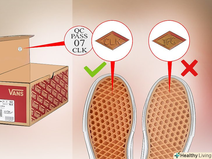 Вивчіть візерунок на підошві. на справжньому взутті фірми Vans можна знайти взаємопов'язаний візерунок двох різних форм: одна — у вигляді ромба, а інша — у вигляді шестикутника. В одному з ромбів повинен бути надрукований код країни з трьох букв. [9]- Трибуквенний код країни повинен відповідати коду на наклейці всередині коробки