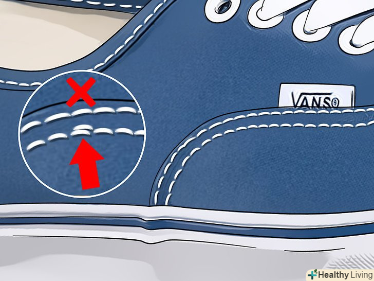 Перевірте шви. у справжнього взуття фірми Vans шви тугі і міцні. Якщо ви бачите подвійний шов з двома стяжками в одній дірці, то, швидше за все, взуття підроблена. Те ж саме стосується взуття, де хоча б один шов нерівний або дірки розташовані на нерівній відстані один від одного. [10]