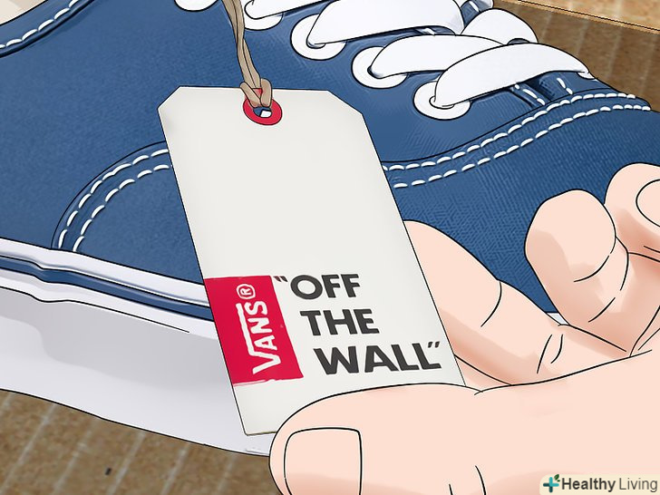Порівняйте паперові бирки. на кожній парі взуття Vans повинна висіти паперова бирка з логотипом компанії. Якщо у вас на руках є оригінальна пара, Порівняйте розмір і шрифт на паперових бирках. Зазвичай на підробленому взутті Vans паперові бирки більше. [6]