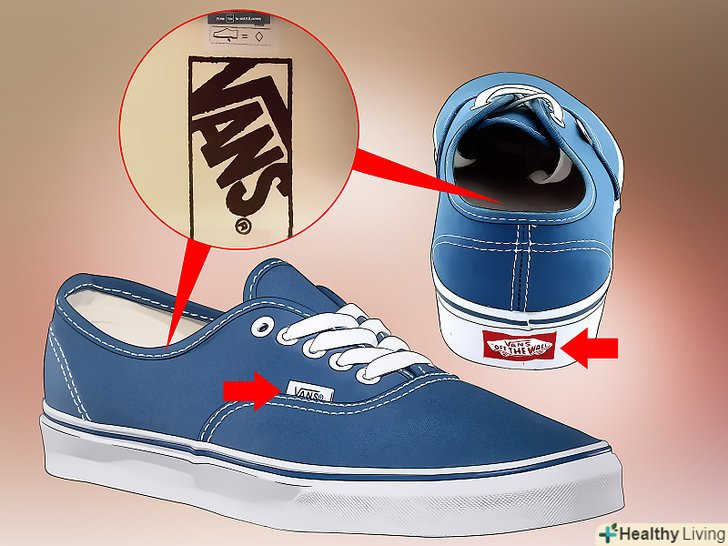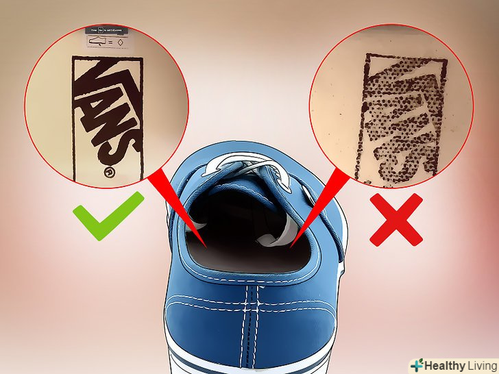 Перевірте фірмовий знак на наявність помилок. назва на всіх логотипах має бути правильно написано. Порівняйте шрифт на логотипі даної пари взуття і пари, в чиїй оригінальності ви не сумніваєтеся.- Колір надрукованого фірмового знака може змінюватися, однак шрифт завжди повинен бути однаковим. Від букви " V " повинна проходити довга лінія, розтягнута праворуч. Букви " ans " повинні знаходитися під лінією. [7]
