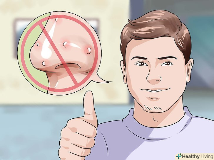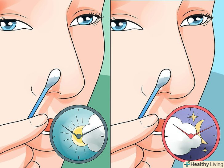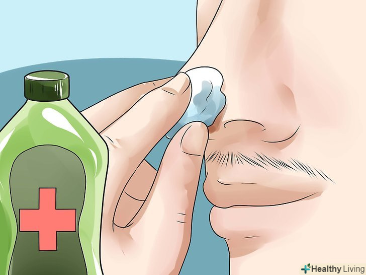 Обробляйте ПірсингДва рази на день. можна використовувати стерильний фізіологічний розчин, перекис водню або змішати воду з милом у співвідношенні 1:1. Обробляйте місце проколу два рази в день. Для цього змочіть ватяну паличку або ватний тампон в розчині і прикладіть на кілька хвилин до пірсингу. Обробляти прокол потрібно зовні і всередині носа. Якщо ви вставили в ніс кільце, то, роблячи обробку, злегка прокручуйте його. [7]- Якщо ви переживаєте, що при проколі могли занести інфекцію, обробляйте Пірсинг кожні кілька годин. В цьому випадку не використовуйте сильні дезінфікуючі розчини — ними не можна користуватися занадто часто.