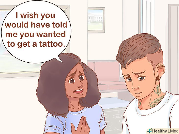 Попросіть партнера обговорювати такі питання з вами. Напевно ви засмучені, адже партнер нічого не сказав вам про свої наміри. Може здатися, що він не цінує вашої думки. Вам слід пояснити, що саме ви відчуваєте. Якщо партнер зрозуміє, що негативна реакція на татуювання викликана емоційним болем, то він зможе краще зрозуміти вашу позицію і в майбутньому почне радитися з вами в подібних питаннях. [6]