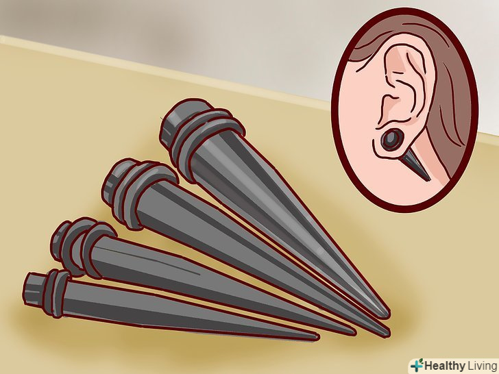 Через кілька тижнів після розтягування ви можете продовжувати носити ювелірні вироби. після того, як ви розтягнули мочки вух до потрібного діаметру, почекайте кілька тижнів. Якщо ви не відчуваєте ніяких проблем (таких як біль або кровотеча), то можете продовжити носити ювелірні прикраси. Перші кілька тижнів віддавайте перевагу прикрасам з силікону або органічних матеріалів. Якщо такі прикраси не викликали проблем протягом декількох днів, ви можете переходити до прикрас з хірургічної сталі, титану або скла. [15]