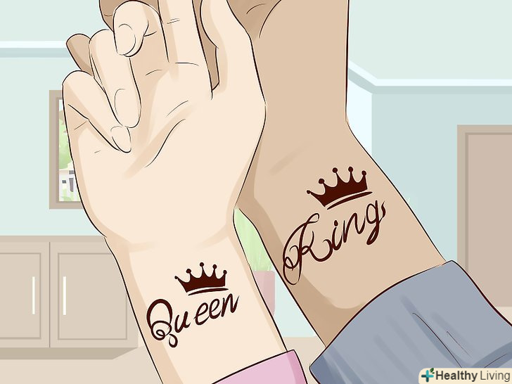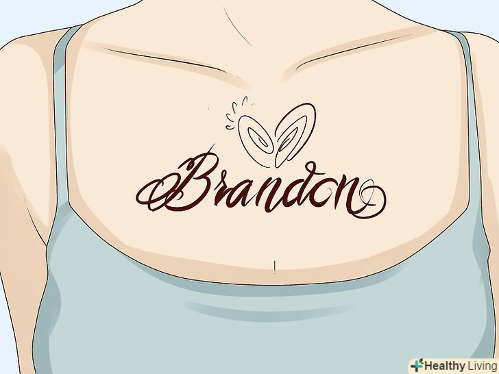 Набийте ім'я коханої людини. татуювання-чудовий спосіб вшанувати батьків, братів, сестер, дітей та подружжя. Можна набити одне лише ім'я, а можна оточити ім'я красивим візерунком, який висловить індивідуальність цієї людини. Наприклад, якщо ви робите татуювання для свого чоловіка, який любить садівництво, можна набити поруч з його ім'ям троянду. [11] Набийте ім'я коханої людини. татуювання-чудовий спосіб вшанувати батьків, братів, сестер, дітей та подружжя. Можна набити одне лише ім'я, а можна оточити ім'я красивим візерунком, який висловить індивідуальність цієї людини. Наприклад, якщо ви робите татуювання для свого чоловіка, який любить садівництво, можна набити поруч з його ім'ям троянду. [11]- Варто добре подумати і почекати перед тим, як набивати ім'я коханої людини. Зазвичай ці татуювання часто зводять або перекривають в довгостроковій перспективі.