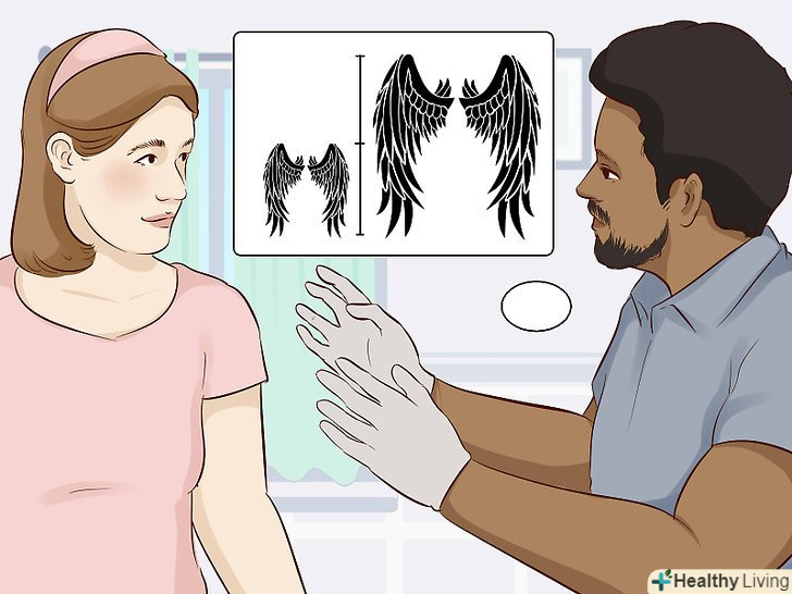 Вирішіть, якого розміру буде ваша татуювання. Розмір-важливий критерій для татуювання, тому що від розміру залежить те, який проект вам підійде. Наприклад, дуже докладний Красивий портрет навряд чи вийде набити на маленькій ділянці шкіри. А татуювання простенького ескізу (наприклад, музична нота) буде виглядати дивно і нерозумно на великій ділянці тіла. [3] Вирішіть, якого розміру буде ваша татуювання. Розмір-важливий критерій для татуювання, тому що від розміру залежить те, який проект вам підійде. Наприклад, дуже докладний Красивий портрет навряд чи вийде набити на маленькій ділянці шкіри. А татуювання простенького ескізу (наприклад, музична нота) буде виглядати дивно і нерозумно на великій ділянці тіла. [3]- Поговоріть з татуювальником, обговоріть розмір, ескіз і можливу локалізацію татуювання.