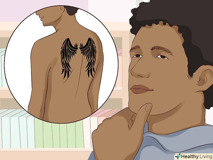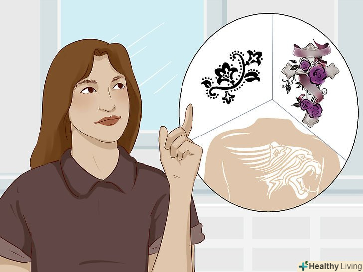 Подумайте, де б ви хотіли набити татуювання. перш ніж приймати рішення, потрібно подумати, наскільки видимою повинна бути ця татуювання, а також як вона буде виглядати через якийсь час. Якщо вам не можна показувати татуювання на роботі, не варто вибирати видиму частину тіла (наприклад, руки, зап'ястя, щиколотки, шию). Попросіть татуювальника порадити вам, де краще набити татуювання. При цьому не варто вибирати області тіла, на яких шкіра буде розтягуватися, спотворюючи татуювання (наприклад, нижню частину живота). [4] Подумайте, де б ви хотіли набити татуювання. перш ніж приймати рішення, потрібно подумати, наскільки видимою повинна бути ця татуювання, а також як вона буде виглядати через якийсь час. Якщо вам не можна показувати татуювання на роботі, не варто вибирати видиму частину тіла (наприклад, руки, зап'ястя, щиколотки, шию). Попросіть татуювальника порадити вам, де краще набити татуювання. При цьому не варто вибирати області тіла, на яких шкіра буде розтягуватися, спотворюючи татуювання (наприклад, нижню частину живота). [4]