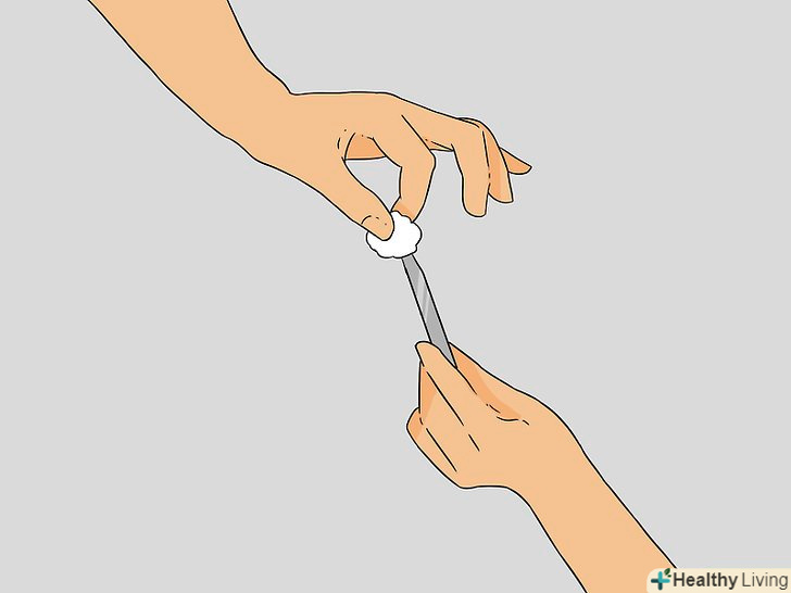 Продезінфікуйте голку і сережки. для проколу вух підійде будь-яка тонка голка або шпилька, однак вам потрібно буде продезінфікувати інструмент, навіть якщо він не використовувався раніше. Намочіть ватний диск спиртом і протріть всю голку. Потім намочіть інший ватний диск спиртом і обробіть всю поверхню сережки. [8]- Найкраще взяти голку, яка не використовувалася раніше.
