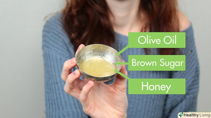 Приготуйте і застосуйте простий скраб з кокосового або оливкового масла, коричневого цукру і меду. змішайте 1 столову ложку кокосового або оливкового масла, 1 столову ложку меду і 2 столові ложки коричневого цукру. Втирайте отриманий скраб в губи дрібними круговими рухами пальців. Залиште його впливати на 1-2 хвилини, а потім змийте теплою водою. Завершіть процедуру нанесенням бальзаму для губ. [17]- Якщо скраб вийшов занадто густим, додайте більше масла або меду. Якщо він занадто рідкий, додайте більше цукру.