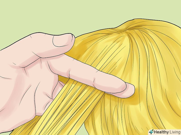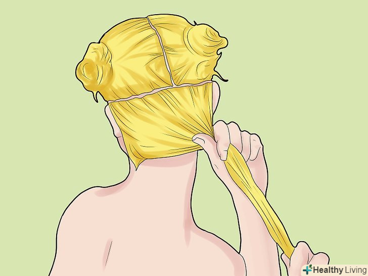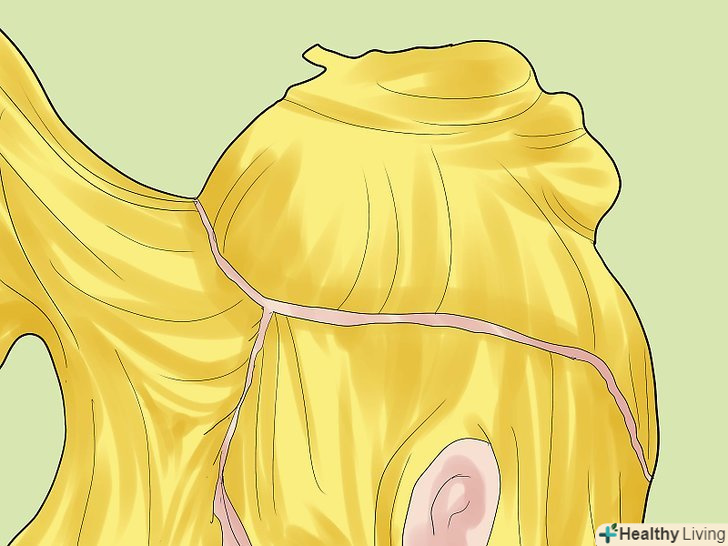 Розділіть волосся навпіл уздовж проділу по центру голови. проведіть проділи до задніх сторін вух, виділивши, таким чином, 2 пасма.