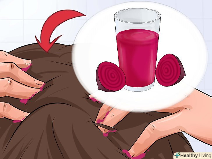 Спробуйте буряковий сік. якщо ви коли-небудь готували буряк, Ви знаєте, як сильно вона бруднить. Щоб надати вашому волоссю природний червоний відтінок, використовуйте буряковий сік. Перемішайте його з дистильованою водою і акуратно намочіть їм ваше волосся. Дайте йому вбратися 20 хвилин і обполосніть волосся теплою водою.