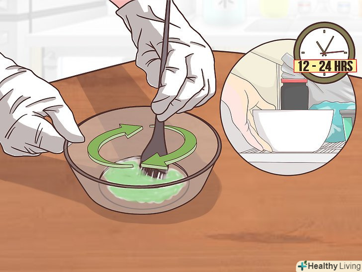 Приготуйте хну. Якщо у вас світле волосся, вам доведеться попередньо пофарбувати їх хною. Насипте невелику кількість хни в миску. Налийте туди ж трохи гарячої води. Потім додайте трохи лимонного соку або оцту. Розмішуйте склад, поки він не загусне. Потім почніть потроху додавати воду, щоб надати складу кремоподібну консистенцію. Після цього необхідно загорнути миску в поліетилен. [2]- Приготувати хну слід за день до фарбування волосся. Рекомендується потримати склад в холодильнику від 12 до 24 годин, щоб хна віддала свої фарбувальні речовини.