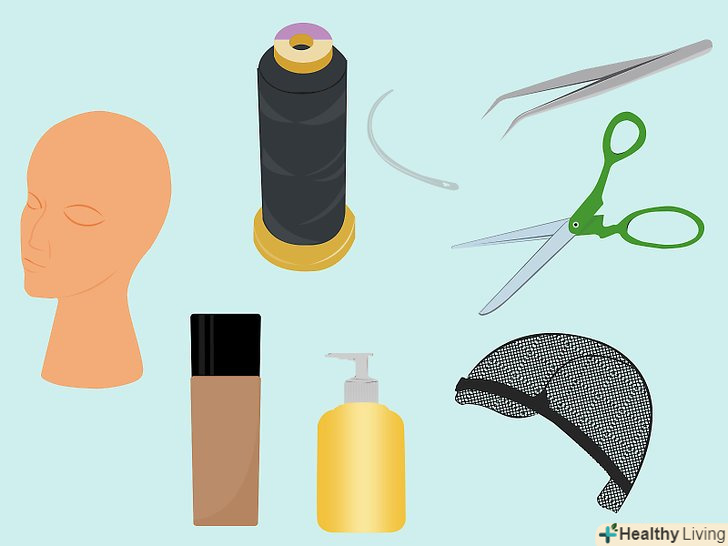 Зберіть всі матеріали. позичаєте ви необхідне у друзів або купуєте необхідні предмети в магазині косметики та парфумерії, вам в будь-якому випадку знадобляться: пінопластова голова під перуку, підставка для нього, шапочка під перуку, професійні нитки і голки для пришивання Волосся, ножиці, пінцет, основа для перуки і засоби по догляду за волоссям. Розрахувавши бюджет, упевніться, що ви вибрали кращі матеріали за доступною ціною. Можна пошукати в Інтернеті вживані приналежності, щоб скоротити витрати.