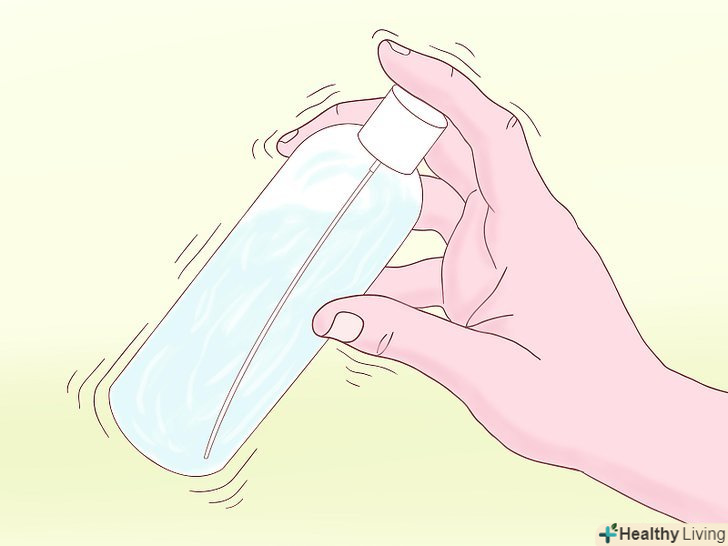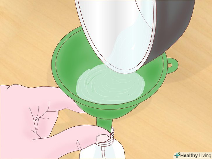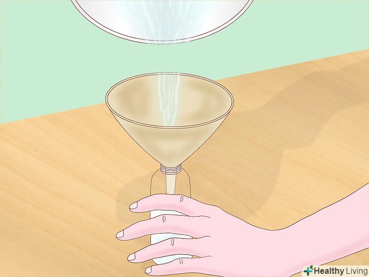 Обережно вилийте суміш в пульверизатор. вставте воронку в шийку пульверизатора. Тримайте пляшку рівно і обережно вилийте в неї суміш. Вилийте суміш в скляний пульверизатор, якщо він у вас є, особливо, якщо ви додавали ефірні масла. Деякі люди кажуть, що ефірні масла з часом роз'їдають пластик, з якого зроблений пульверизатор.- Чим менше буде аерозоль, тим ефективніше буде лак. [9]