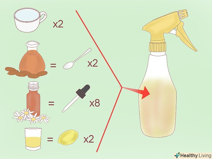 Змішайте лимонний сік з водою, щоб отримати освітлюючий лак для волосся. вилийте в пульверизатор 475 мл води, 10 мл мигдалевого масла, 10 крапель ефірного масла ромашки і сік з двох лимонів. Закрийте пляшку і гарненько її струсіть, щоб перемішати інгредієнти. Нанесіть спрей на мокре або сухе волосся кілька разів на тиждень. [11]- Лимонний сік і ефірна олія ромашки освітлять волосся і зроблять їх більш яскравими. Мигдальне масло виконує роль кондиціонера для волосся.
