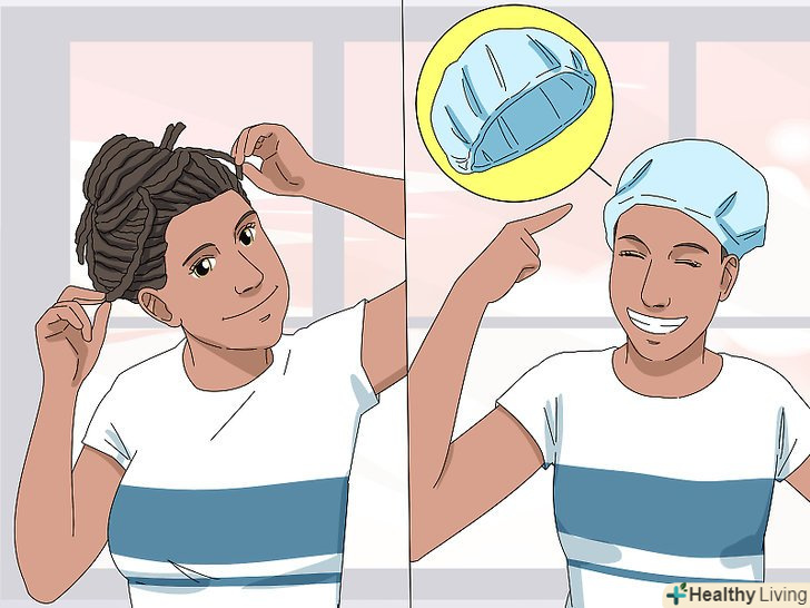 Згорніть свої коси. Зберіть коси в захисну зачіску. Зберіть косички в пучок і закріпіть їх на маківці. Якщо у вас короткі коси, спробуйте зв'язати їх на потилиці або з боків голови. Накрийте голову поліетиленовою шапочкою, щоб коси опинилися під нею. [14]- Якщо у вас немає поліетиленової шапочки, спробуйте закріпити косички за допомогою поліетиленової плівки. Короткі косички сильно полегшать вам завдання.