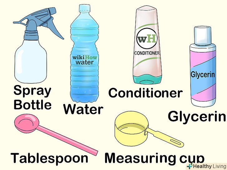 Зберіть все необхідне. швиденько змішайте легкий зволожуючий засіб з тих інгредієнтів, які у вас, швидше за все, вже є. Використовуйте кондиціонер, яким зазвичай користуєтеся. Вам не складе труднощів щодня наносити цю суміш на волосся. Ось, що вам знадобиться: [3]- Розпилювач