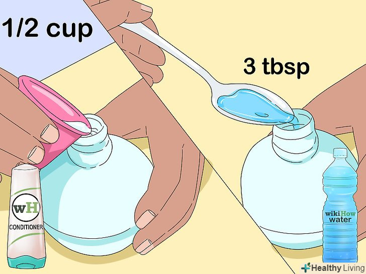 Додайте кондиціонер і воду в розпилювач. додайте 120 мл кондиціонера в розпилювач. Додайте 45 мл води і закрутіть кришку. Струсіть суміш, поки вода повністю не змішається з кондиціонером. [4]- Вода дозволяє розбавити кондиціонер в достатній мірі, щоб його можна було розпорошити на коси.