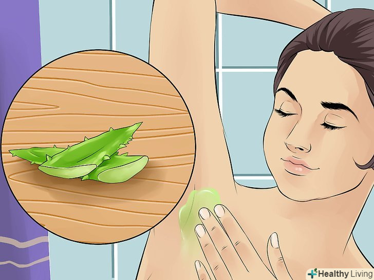 Зніміть подразнення шкіри. врослий волосся може пошкодити здорову шкіру і дратувати її — це особливо справедливо для таких чутливих місць, як пахви. Постарайтеся заспокоїти шкіру: нанесіть на роздратоване місце трохи соку алое вера або м'якого зволожуючого засобу. [13]- Постарайтеся зробити це в той час, коли ви зможете відпочити і почекати, поки сік алое вбереться в шкіру. Якщо вам необхідно відразу ж йти, сік витреться і дасть менший ефект.
