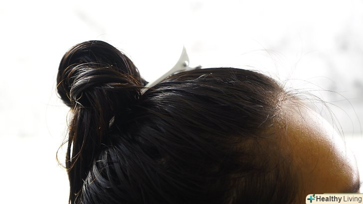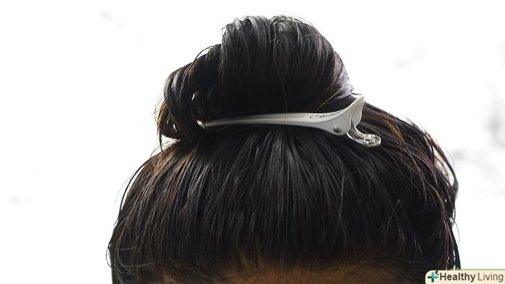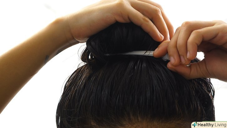 Зберіть волосся в пучок і закріпіть його пластиковою шпилькою. від масла фарба з металевої шпильки може перейти на волосся, тому використовуйте пластикові шпильки. Якщо ви хочете збільшити ефективність маски, то накрийте волосся поліетиленовою шапочкою для душу. Вона збереже тепло і дозволить масці проникнути глибше у волосся. [6]