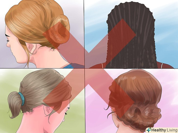 - Якщо вам з якоїсь причини обов'язково треба скріпити волосся ззаду, то є способи зробити це з мінімальним навантаженням на волосся. Зробіть хвіст, пучок або косу якомога більш вільними. Крім того, хвіст або пучок, скріплений нижче висоти вух, створить менше навантаження на коріння, ніж якщо ви скріпите його високо. [7]