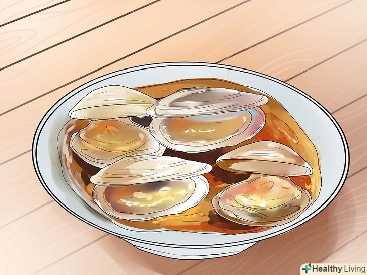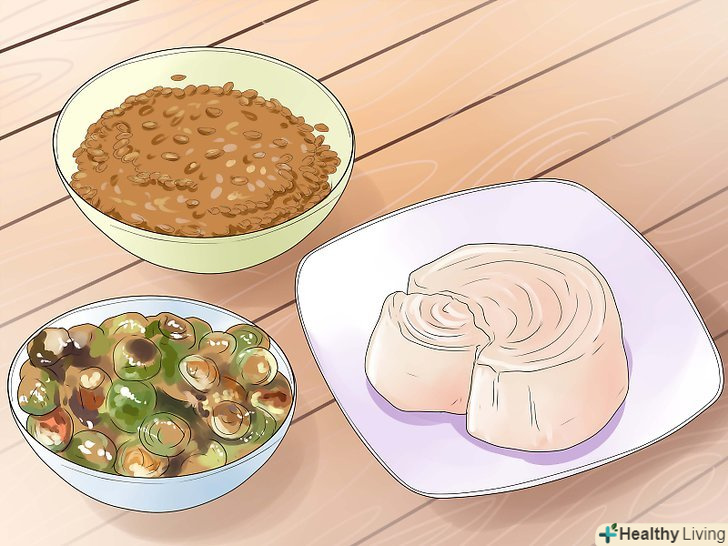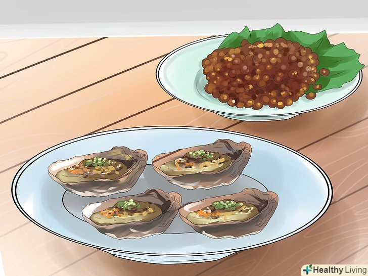 Зверніть увагу на продукти, що містять залізо. залізо можна знайти в багатьох продуктах, включаючи темну листову зелень, цільні злаки, червоне м'ясо, устриці, боби, молюски.- Залізо покращує кровотік по всьому організму. Без нього кров не зможе доставити достатньо кисню до клітин шкіри голови, і вам не вдасться активізувати сплячі фолікули.