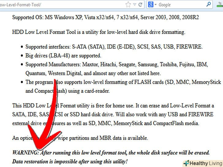 Джерела програмного забезпечення: З'ясуйте, яка компанія виробила ваш жорсткий диск, і подивіться, чи є у них утиліта, яка буде робити низькорівневе форматування. Ця частина важлива, тому що вона видаляє всі дані з жорсткого диска, так що ніхто не може отримати їх назад, в тому числі і вірус. Деякі загальні інструменти виробників жорстких дисків для цього можна знайти тут.