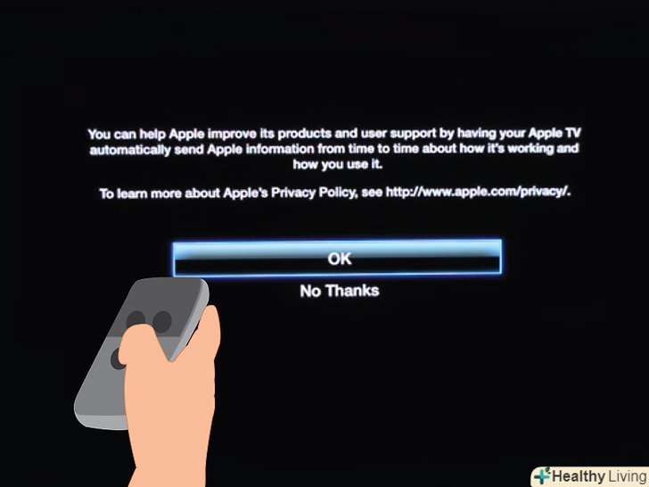 Зачекайте, поки Apple TV активується. Apple TV може знадобитися кілька хвилин, щоб виконати початкову настройку. Коли процес буде завершено, вам буде запропоновано приєднатися до програми зі збору даних про користування Apple TV.[2]