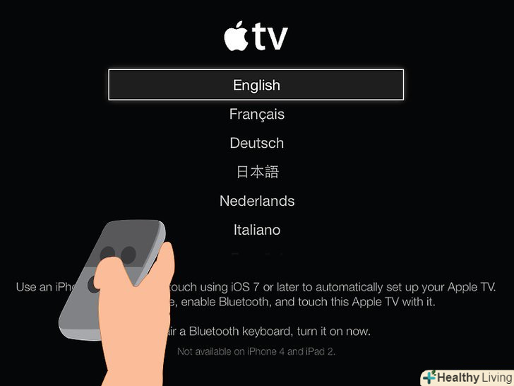 Налаштуйте телевізор на правильне джерело сигналу. натисніть кнопку «Input» (вхідний сигнал) або «Source» (Джерело) на пульті дистанційного керування телевізора, а потім виберіть порт HDMI, до якого підключений Apple TV. Як правило, Apple TV включається автоматично, тому Ви повинні побачити меню, в якому можна вибрати мову. Якщо нічого не відображається, двічі перевірте правильність підключень, а потім натисніть центральну кнопку на пульті Apple TV.