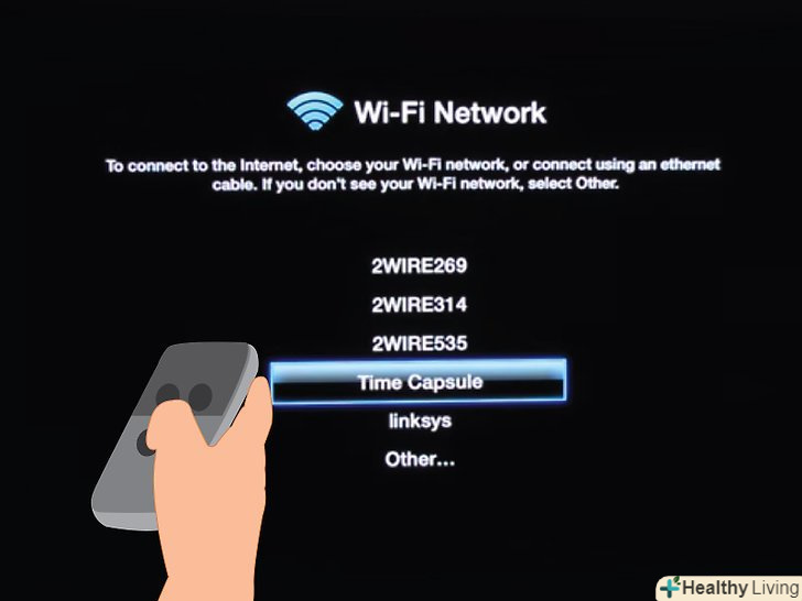 Підключіться до мережі.якщо ви підключені до мережі через Ethernet, Apple TV автоматично виявить мережу і підключиться до неї. Якщо ви підключаєтеся до бездротової мережі, відобразиться список доступних бездротових мереж. Виберіть потрібну мережу і введіть пароль, якщо мережа захищена.
