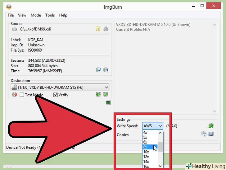 Розкрийте меню "Швидкість запису" і виберіть в ньому значення 8X (або менше).так ви уникнете виникнення помилок в процесі запису диска.