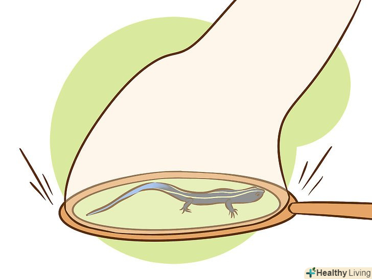 Переверніть сачок так, щоб сцинк провалився всередину сітки. притримуючи картон біля основи сітки, переверніть сачок. Притримуйте картон зверху, щоб ящірка не вистрибнула і не поповзла.