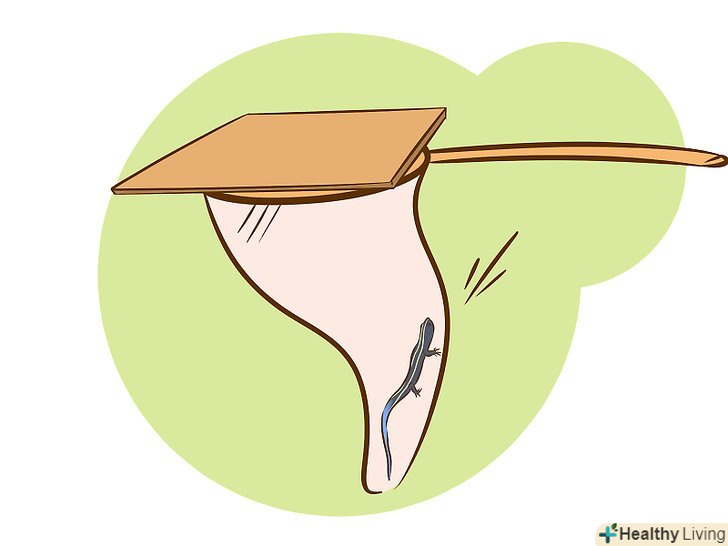 Підкладіть шматок картону або інший щільного паперу під сітку. підкладіть картон під сітку, щоб утримати сцинка в пастці. Таким чином, він не втече, коли ви піднімете сачок.