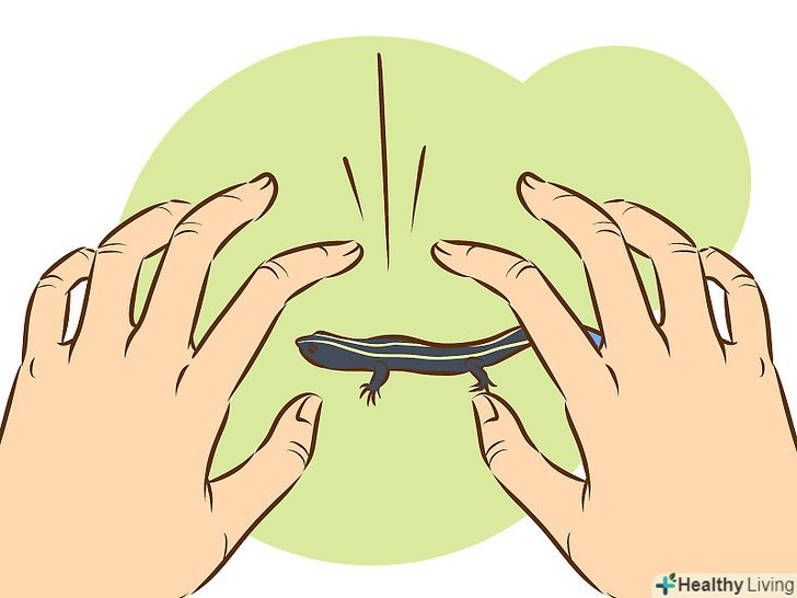 Різко проведіть рукою над сцинком. швидко схопіть ящірку рукою зверху або ззаду. Постарайтеся зловити її за тулуб, а не за хвіст. Якщо ви спробуєте зловити її за хвіст, то є велика ймовірність того, що хвіст просто відвалиться і ящірка втече.- Будьте обережні, не стискайте сцинка занадто сильно, інакше ви можете його травмувати.