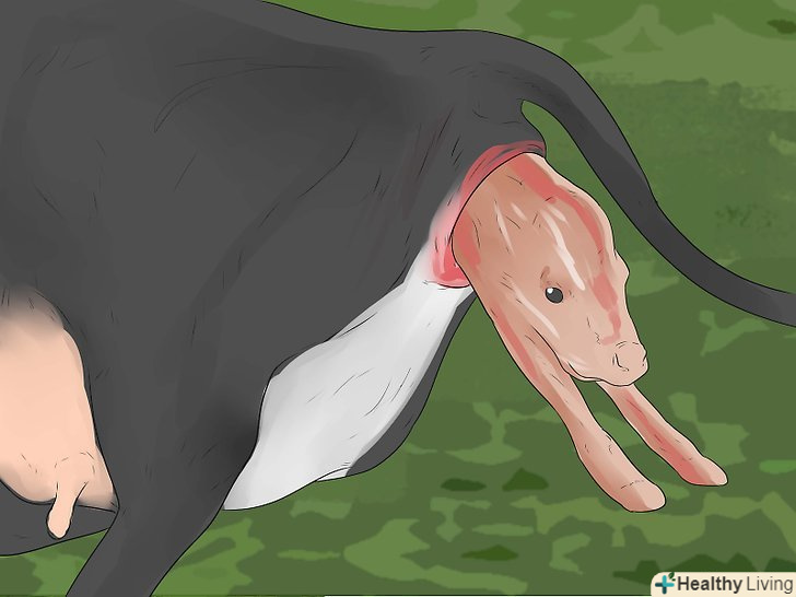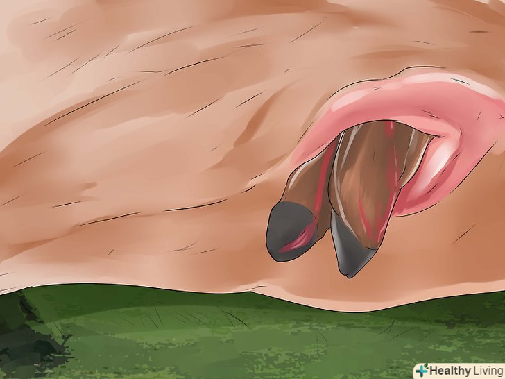 Ноги і голова з'являються з вульви. якщо ноги спрямовані вниз, то теля в правильному положенні. Незабаром за ногами починає виднітися ніс.