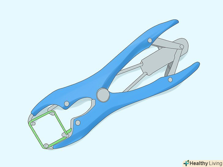 Помістіть кільце над закритим кінцем еластратора. на еластраторі є чотири точки, і коли ручка стиснута, воно відкривається - зелене кільце витягується.