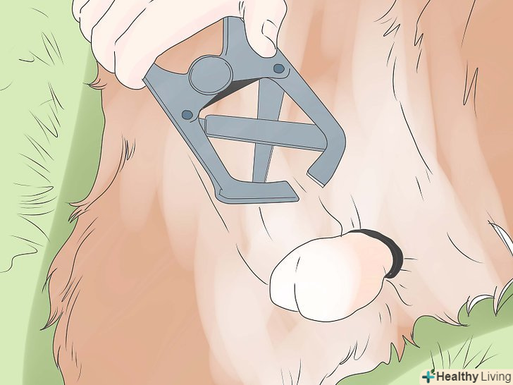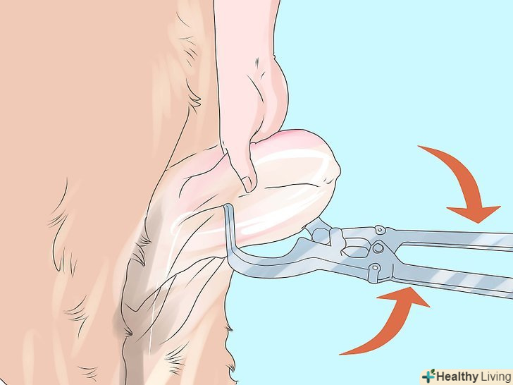 Спосіб 1 для телят постарше: видалення нижнього кінця мошонки- Виконайте ті ж дії, які описані вище для кастрації молодих телят, за винятком витягування яєчок. Замість цього розірвіть частково зв'язку, очищаючи її за допомогою ножа або затиску з емаскулятором.