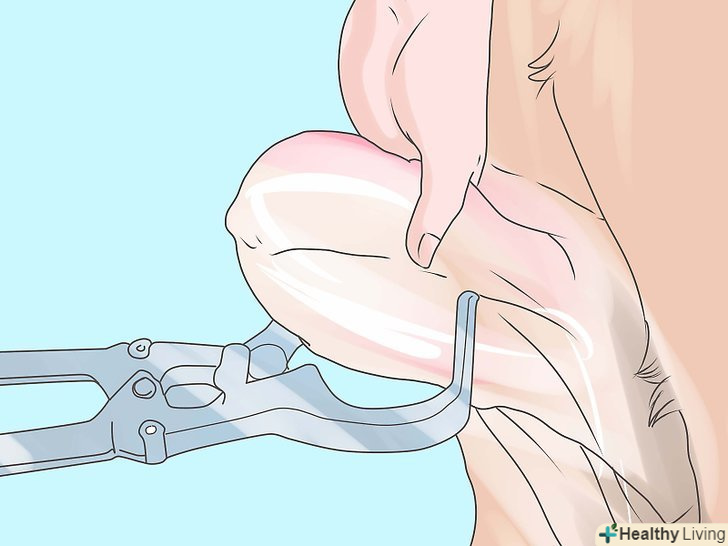 Метод 2: розрізання мошонки вниз в сторони- Потягніть одне яєчко вниз і міцно утримуйте зовні, щоб шкіра мошонки щільно облягала яєчко.