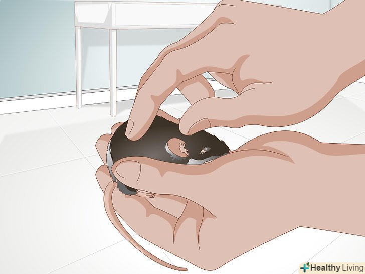 Беріть мишу на руки. після того як миша почне спокійно ставитися до присутності ваших рук в клітці і не буде сприймати це як загрозу, візьміть її на руки. Можна просто акуратно підвести під мишу долоню. Якщо це складно, спробуйте обережно взяти мишу однією рукою біля основи хвоста і швидко перемістити її на долоню другої руки. [10]- Якщо ви збираєтеся взяти мишу за хвіст, беріть її біля самої основи хвоста і не утримуйте довше декількох секунд. Це може викликати у вашого вихованця досить хворобливі відчуття.