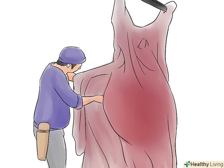 Повісьте тушу, щоб висушити її. як довго вона буде сохнути, залежить від температури повітря, покриття жиру і бажаного аромату. Туша повинна висіти від семи до п'яти днів (деякі кажуть, що два тижні), і довше, якщо вона знаходиться в більш холодних умовах і якщо є велика кількість жиру на туше. Якщо туша повністю покрита жиром, то рекомендується повісити її на 10 днів.- Хороший спосіб дізнатися, чи проводиться сушка м'яса при правильній температурі, це виміряти температуру задньої чверті і інших товстих частин, вона повинна знизитися до 4-7 градусів за Цельсієм протягом 24 годин після забою.