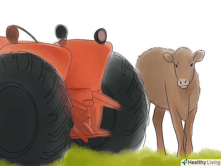 Скористайтеся трактором. переконайтеся, що він має прикріплений Фронтальний навантажувач, інакше ви не зможете зробити решту процесу забою, якщо ви не можете зробити це на землі, як з дикими тваринами (оленем, лосем, ведмедем та іншими). Якщо ви вирішите використовувати цей процес, зверніть увагу, що ви могли б зробити це для зняття шкури передньої частини тварини, але не для видалення нутрощів і розщеплення туші.