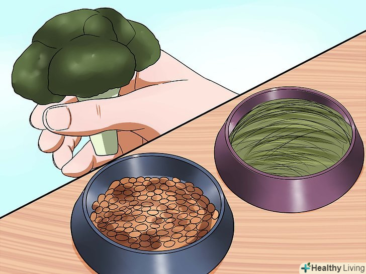 Підберіть правильний корм для кролика. ідеальним кормом для кролика є трава і сіно, для перетравлення яких і призначений їх шлунок. В ідеалі, основу харчування кролика має становити свіже зелене сіно. Його необхідно доповнювати невеликою кількістю екструдованого гранульованого корму (з зовні однакових гранул), а також свіжими фруктами і овочами. Найчастіше кроликам дають брокколі, бок чой, бадилля моркви і буряка, кінзу, листову і качанну капусту, брюссельську капусту, кале та іншу зелень. [10]- Не дозволяйте кролику мати необмежений доступ до гранульованого корму, так як це може привести до ожиріння і виникнення проблем зі здоров'ям. Також уникайте придбання кормів для кроликів з яскравим забарвленням, що мають в складі горіхи, зерна і фрукти. Зазвичай вони занадто багаті цукрами і вуглеводами.