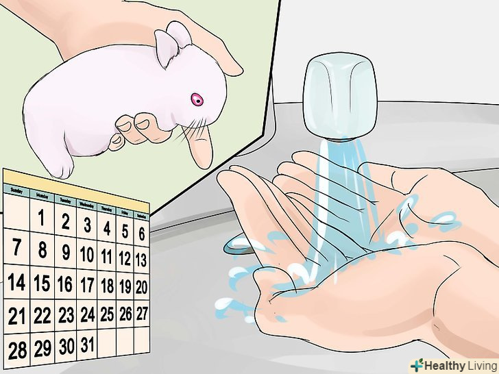 Почніть привчати кроленят до рук у віці восьми тижнів. До закінчення періоду грудного вигодовування малюки будуть дуже схильні до різних захворювань і бактерій, особливо кишковій паличці, яка здатна вбити приплід в лічені години. [20] тому вам необхідно ретельно мити руки кожен раз, коли потрібно взяти на руки молочних кроленят. Після закінчення періоду вигодовування намагайтеся частіше брати малюків в руки, щоб з них виросли більш ручні дорослі кролики.