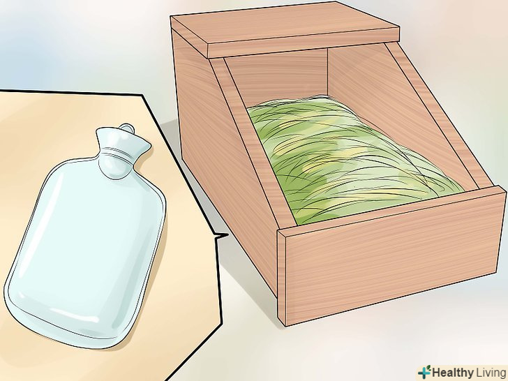 Підготуйте для кролиці гніздовий ящик. кроленята народжуються голими і з самого народження потребують постійного тепла. Наявність в гніздовому ящику теплої підстилки допоможе кролятам зібратися в одному місці і зігрітися. Гніздовий ящик (він може бути представлений картонною коробкою) повинен бути трохи більше розмірів самої кролиці і при цьому забезпечувати бар'єр для новонароджених кроленят висотою близько 2,5 см, щоб вони не виповзли. [4]- Використовуйте в якості підстилки гніздового ящика суху траву (переконайтеся в тому, що вона не була оброблена добривами або пестицидами), солому або сіно. [5] розташуйте підстилку поверх чистого рушника. Переконайтеся, що на поверхні рушники немає стирчать ниток, інакше кроленята можуть заплутатися в них. [6]