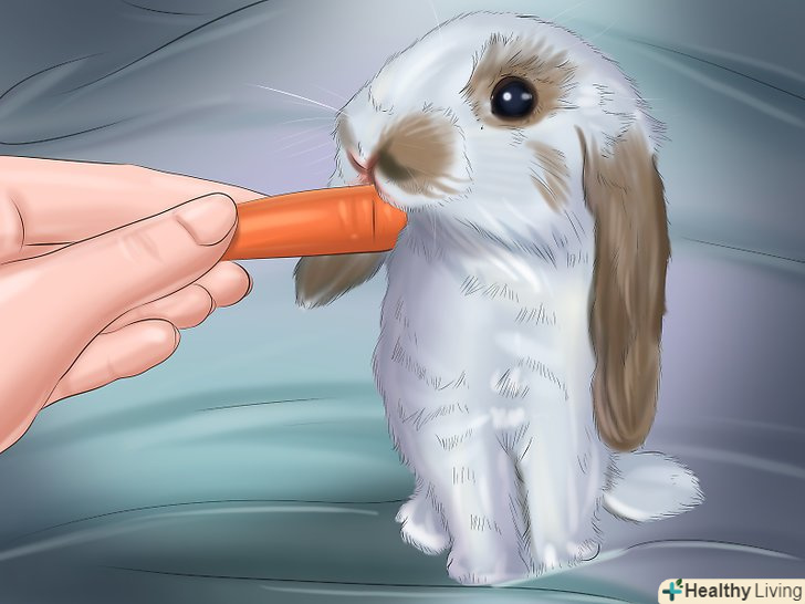 - Запропонуйте кролику ласощі. Це дозволить заспокоїти тварину, якщо воно нервує. Крім того, ласощі корисні кроликам. Запропонуйте вихованцеві маленьку моркву, шматочок яблука або банана або маленьку ложку вівсянки. Дайте кролику з'їсти шматочок ласощі з підлоги, а потім спробуйте погодувати його з руки. [31]
