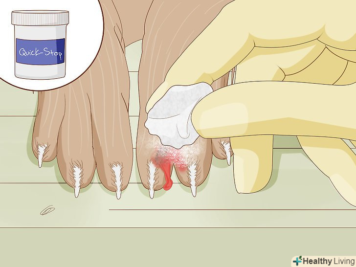 Обробіть кіготь кровоспинним засобом. якщо кіготь був вирваний цілком, вам потрібно показати кролика лікаря, але якщо він просто був зламаний або обрізаний занадто коротко, з цим можна впоратися в домашніх умовах. Нанесіть кровоспинний засіб (можливо, буде потрібно зробити це кілька разів) і час від часу перевіряйте стан рани.