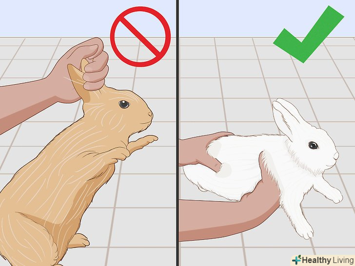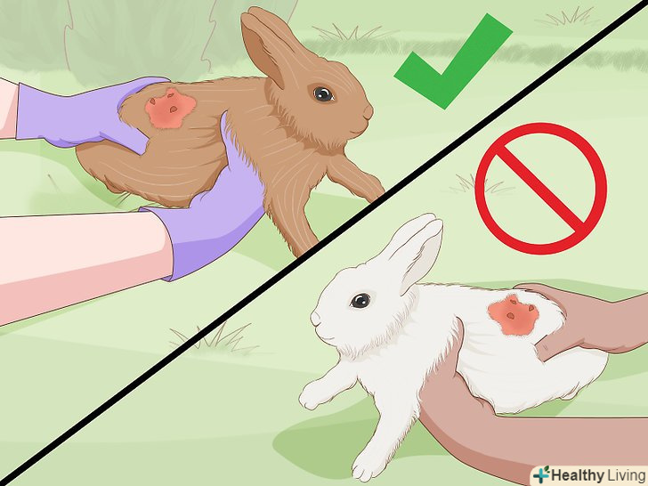Беріть кролика в руки з обережністю. Дикий кролик сприймає цю дію як захоплення хижаком, тому він злякається. Тримайте його правильно, щоб він не злякався і не заподіяв собі шкоди. [14]- Не піднімайте кролика за вуха, за лапи або за загривок. Підставте одну руку під груди, а другу під задню частину тулуба. Голова повинна бути трохи вище тулуба-це не дасть кролику вкусити або подряпати вас.