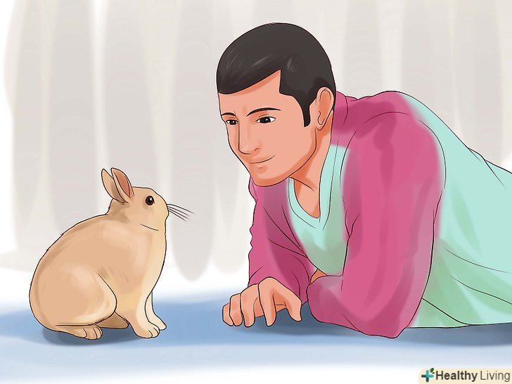 Опустіться до рівня кролика. Вам необхідно подбати про те, щоб кролик відчував себе в безпеці і комфорті під час ігор. Ви не повинні здаватися йому надмірно великим.- Постарайтеся опуститися до його рівня. Ви можете присісти, опуститися навпочіпки або прилягти на підлогу.